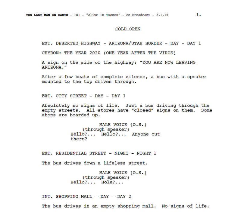 Compare the above opening page of the single-camera The Last Man on Earth pilot script to the pilot script of the multi-camera The Big Bang Theory below: