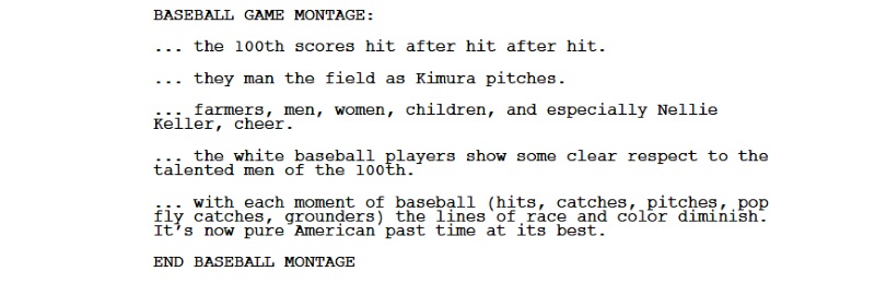 In this scene, the single location is a baseball field as Japanese-American soldiers play a game of baseball against a local white team. This example would be perfect for those writing the inevitable montage sequences found in sports movies.