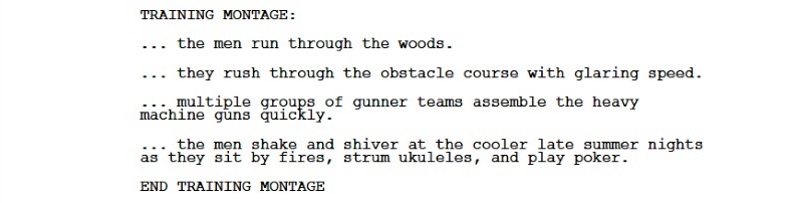 Here's another example of a single location montage from the spec script The Purple Heart Battalion. The script tells the true story of the all-Japanese-American infantry during WWII that battled racism and prejudice while trying to prove themselves ready to fight for their country.