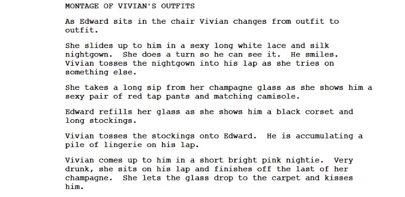 As you can see, the montage opens with a header that dictates what type of scene this is — MONTAGE. That header alone would have been enough, but the writer chose to be more specific by adding OF VIVIAN'S OUTFITS.