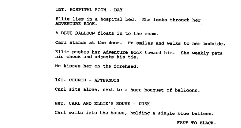 The best example using this simple screenwriting format to convey a montage can be found in arguably the greatest — and most touching — montage sequence ever to grace the screen, found in Pixar's Up.