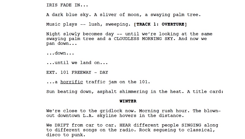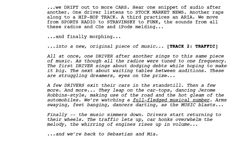 You'll also notice that there are no song lyrics and singing character names within that sequence. Instead, Chazelle references the songs by particular tracks and track titles. This obviously points to the fact that the people reading the script also had an accompanying CD or digital playlist to reference. This type of formatting is specific to those that will also have the ability to get the pre-recorded music into the hands of the powers that be considering the script.
