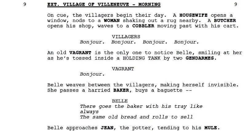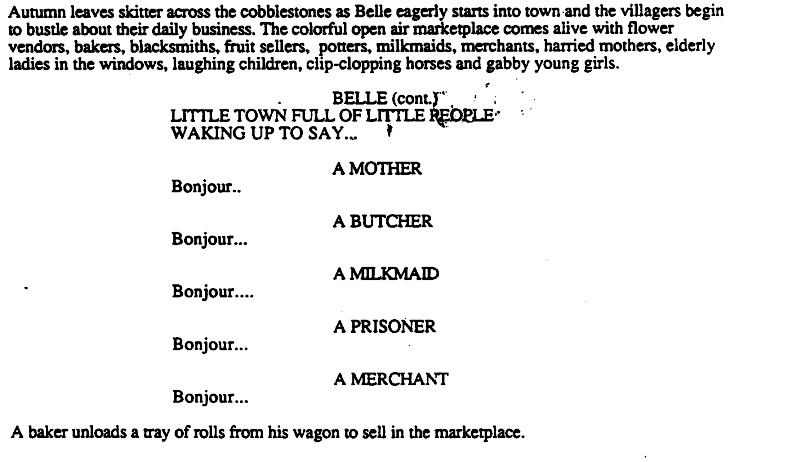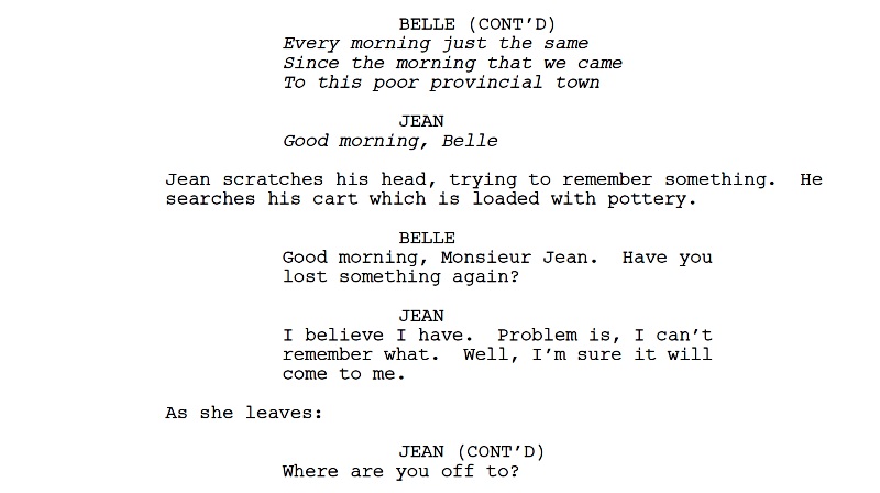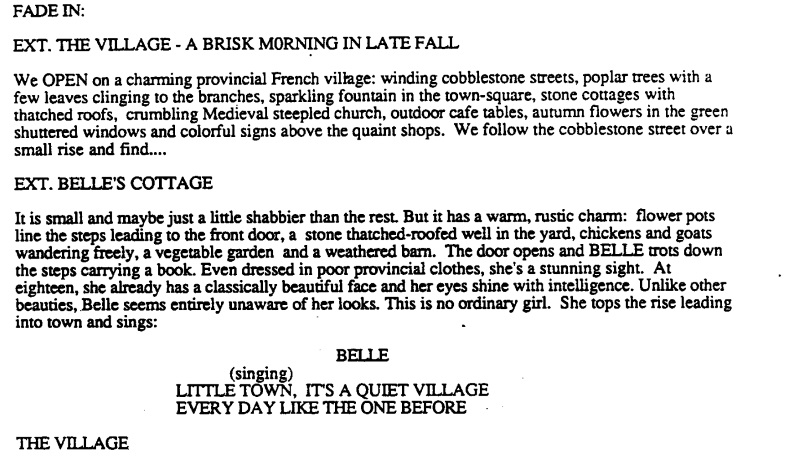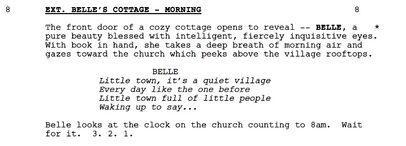 With the lyrics, the script initially used parenthesis first to dictate that Belle was (singing). From that point on, the screenplay just has the lyrics in FULL CAPS and written in standard lyric format of having one single line denotes one sung line, as opposed to the lyric lines running together in blocks, separated only by periods, question marks, and exclamation marks, as is the case for standard dialogue.