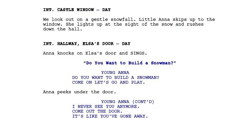 The shooting script for Disney's animated feature Frozen offered an additional option as well.