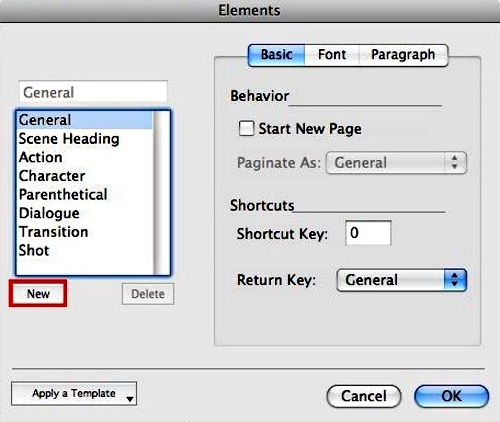 4. Go through each tab setting -- Basic, Font, and Paragraph, and customize the new element's look and behavior (in the case of lyrics, you'll want to set them to paginate as dialogue);