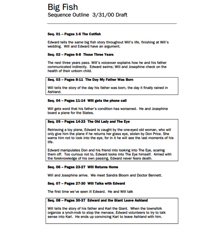 Here is an example that Hollywood screenwriter John August shared on his podcast site. The script he was developing was Tim Burton's Big Fish.