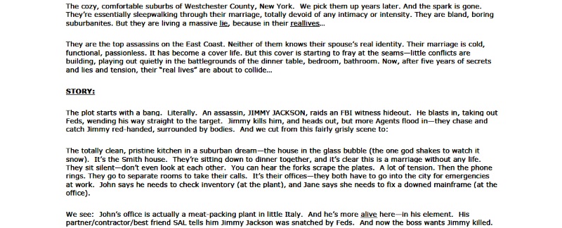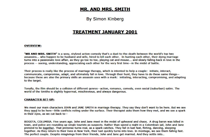 Hollywood screenwriter Simon Kindberg shared the treatment for his eventual action hit Mr. and Mrs. Smith over at Creative Screenwriting Magazine.