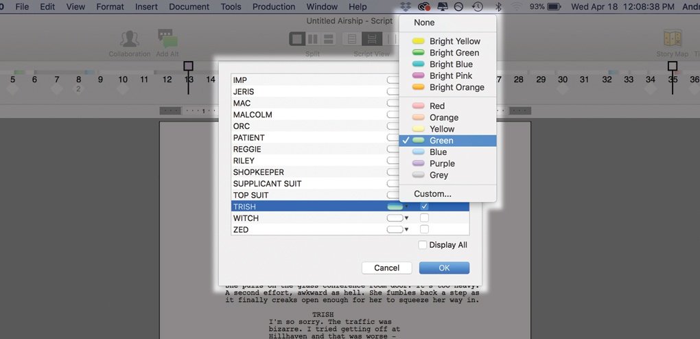 A handy and lesser-known tool in Final Draft is Highlight Characters. The Highlight Characters tool is used to color-code individual characters and their dialogue, making table reads and scheduling and prepping for performances a breeze.