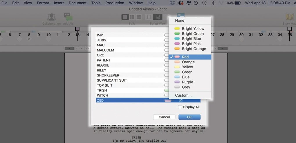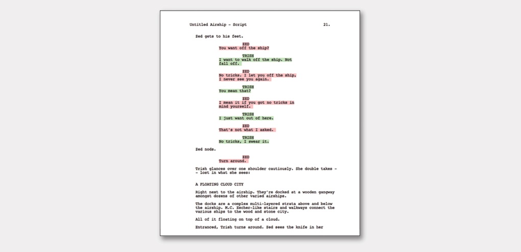 Open the Final Draft sample script, Airship, by going to Help > Sample Script > Script. Once the script is open, you will see that Trish and Zed are the script’s main characters. We’re going to Highlight their dialogue.