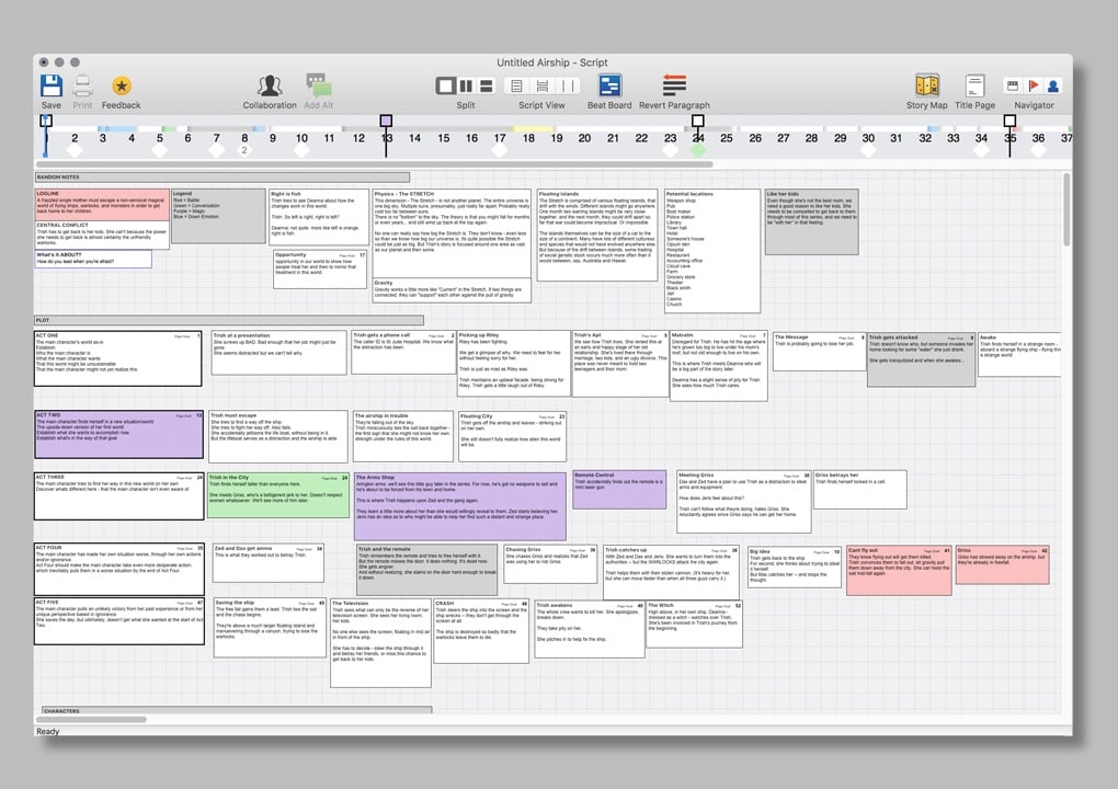 The Beat Board is designed as a pre-writing tool, one that allows the user to lay out parts of the story at any magnification – that is, each Beat can represent one section of a scene, a part of a conversation, a scene, a group of scenes, a sequence, an act, an episode, a season – whatever size story unit you need. A Beat doesn’t even have to be a plot point, it can be a character description, a theme, a song you want to use or a wardrobe plan. The Beats are not organized into a grid, they can be grouped, colored and placed wherever the user wants to see them. It’s a non-linear way to lay out story, structure, plot, subplot, character arcs – any part of a script that can be broken down into component pieces.