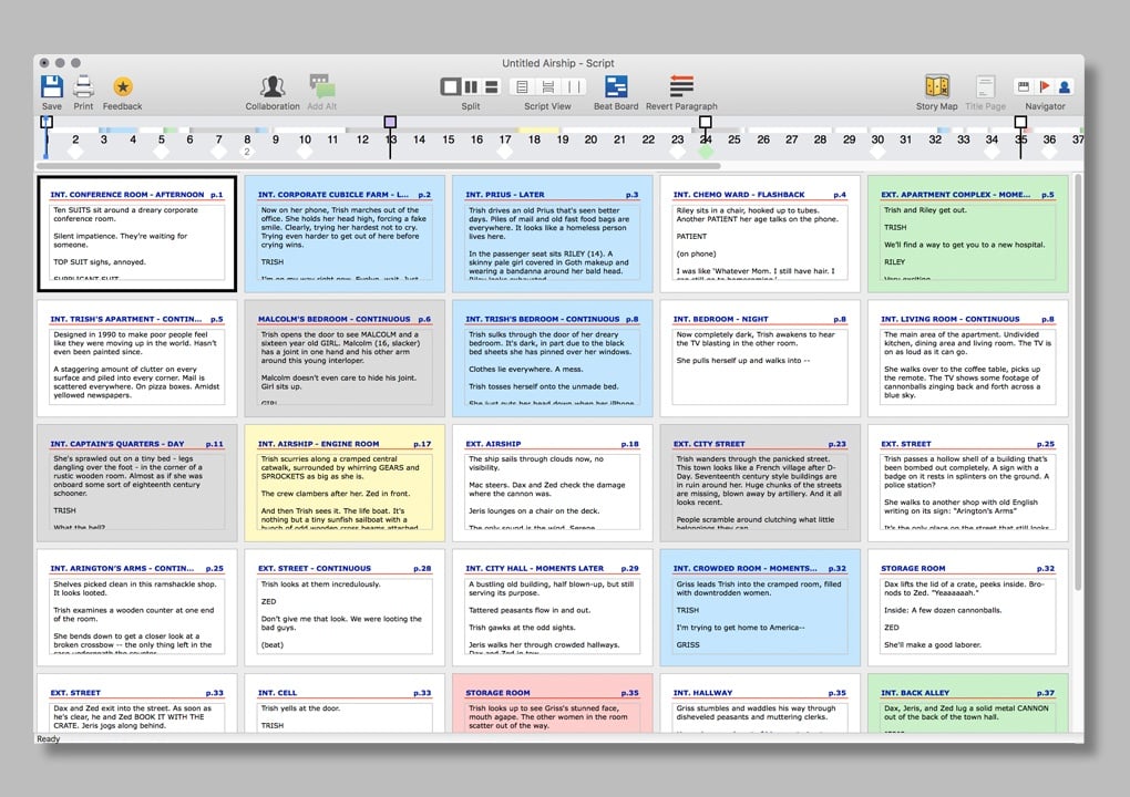 The Index Cards, on the other hand, are more useful once you’ve gone to pages and now want to see a high-altitude view of the scenes that have already been written. They are locked into a grid and each card represents a scene and nothing but a scene (scene heading to scene heading). If you like you can start with one card (one scene) and add new cards (scenes) as you go, but you can view them only in order of appearance in the script and only as individual scenes, not parts of scenes or groups of scenes.