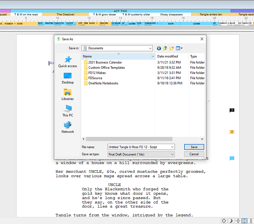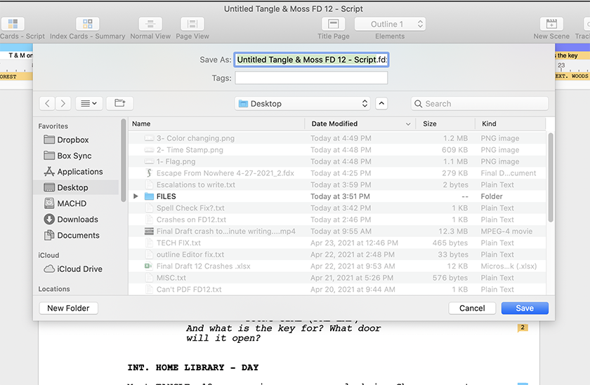 First, let's be clear: Final Draft does not store your files — scripts, outlines, or otherwise. Final Draft is the software you use to create your work, and that work is saved in files with the extension FDX. These FDX files have to be saved somewhere.Let’s think of your computer as a desk. Final Draft 12 (or whichever version you're currently working on) is a pen on that desk. The FDX files that you create in Final Draft are pieces of paper. At the end of a work session, you have to decide where to put your pieces of paper. This will be done when you click Save As. Every time you click Save As, you will be shown this window: