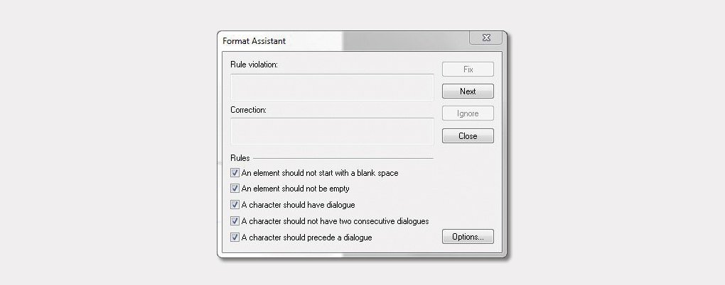 Fear not, because Final Draft is here to help. Before you hit that Send button, go to Tools > Format Assistant and have this utility scan the script for several common and easily-missed formatting errors: