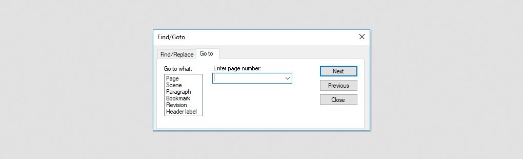 Not when you’re writing a script and it’s due tomorrow and you need to find something. Command + G (Mac) or Control + G (Windows) brings up the Go To window, and from this panel you can quickly move around in the script without foolishly wasting time (as described above).