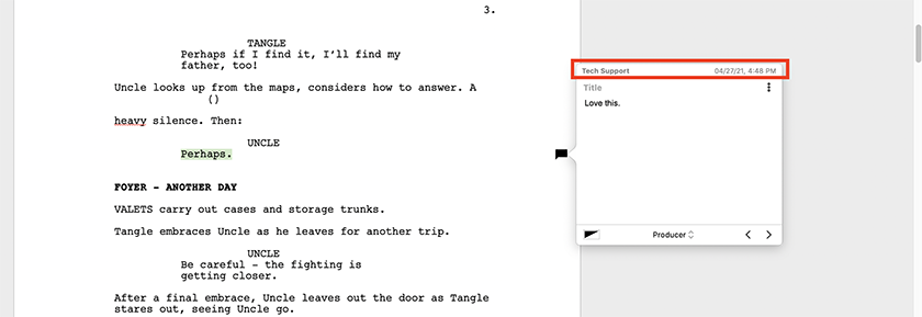 Instead of a black flag, the ScriptNotes icon now looks more like a speech bubble. There’s also no need to access the Navigator for your notes, because now you can view them side by side with your script.