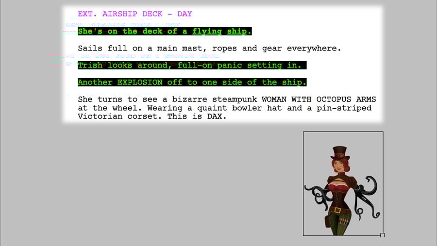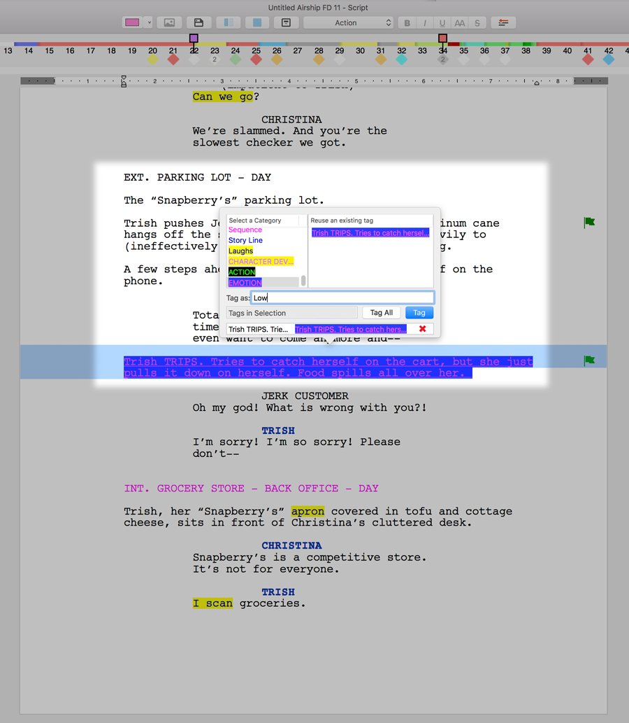 Airship’s protagonist Trish is introduced on page 4 and sets the stage for her character’s journey. Highlight the Scene Heading and character descriptions by clicking-and-dragging or triple-clicking. The Tags menu will display; choose Character Development and hit Tag.