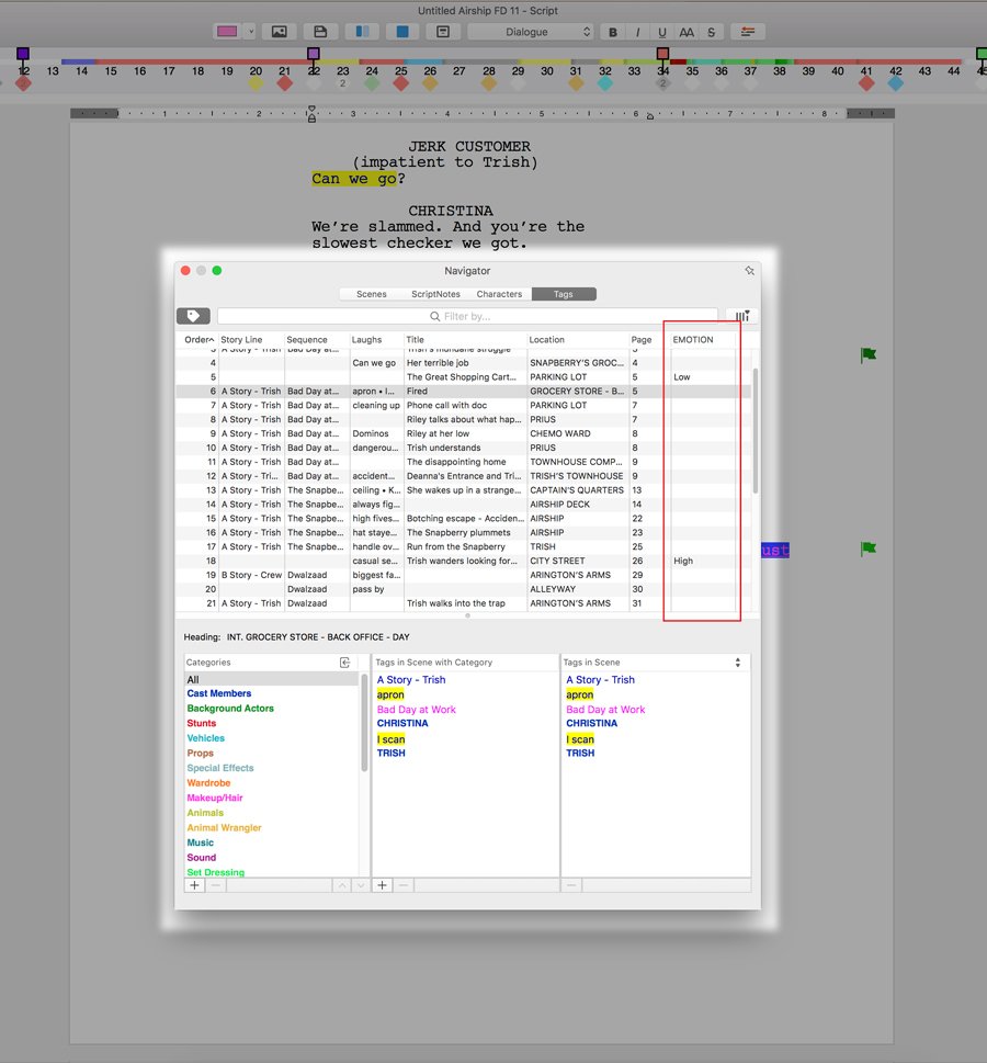 Another way writers can use Tagging is by tracking a character’s arc through their emotional highs and lows. Open the Navigator and click on scene 5; click the plus sign and add a category titled “Emotion.” Color the text hot pink with a deep blue highlight color and check off the box next to underline. Highlight the scene heading, choose the Emotion category and Tag it as Low to denote a low point for your character’s emotional arc.