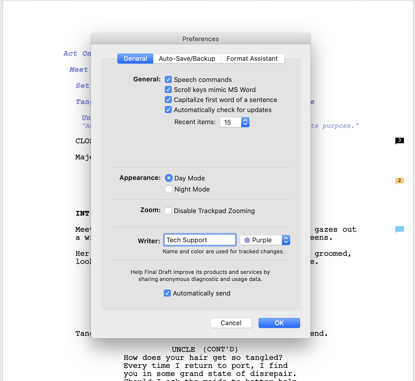 You can also use Track Changes to mark up an entire script and send it to a collaborator, and your collaborator can click Accept or Reject and make changes of their own. This also works using Final Draft 12’s online collaboration feature! You can even control how your name and markup color appear by going to the Preferences menu.