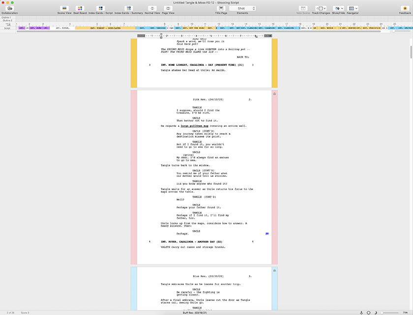 Revision Mode features multiple sets, which you can think of as sort of similar to version numbers. If your locked script is version 1.0, then blue revisions would be version 1.1; any changes that are made by the heads of production or other members of the team would be implemented in blue revisions. Each page that has even one change will be shown as a revised page, so people in production can easily and quickly spot the differences.