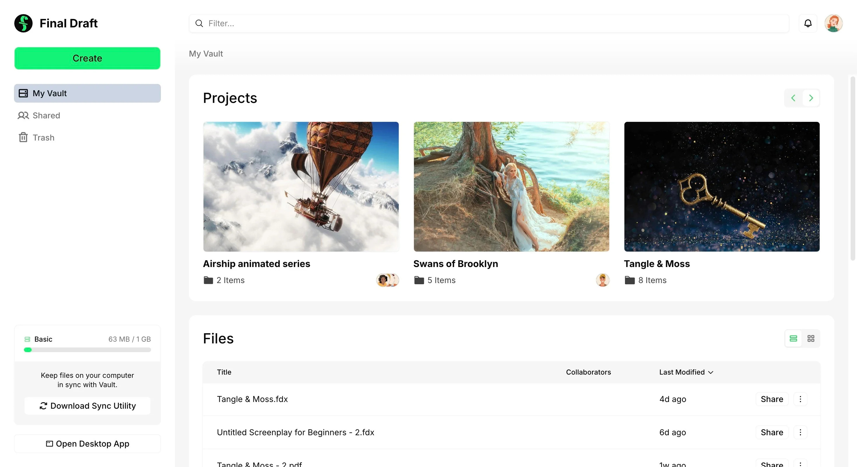 Write your script online in an interface perfect for beginners, organize your projects with custom folders, store essential materials, and sync to the Final Draft Vault for secure Cloud storage. Also comes with optional desktop-to-cloud syncing available via the Final Draft Vault Sync.